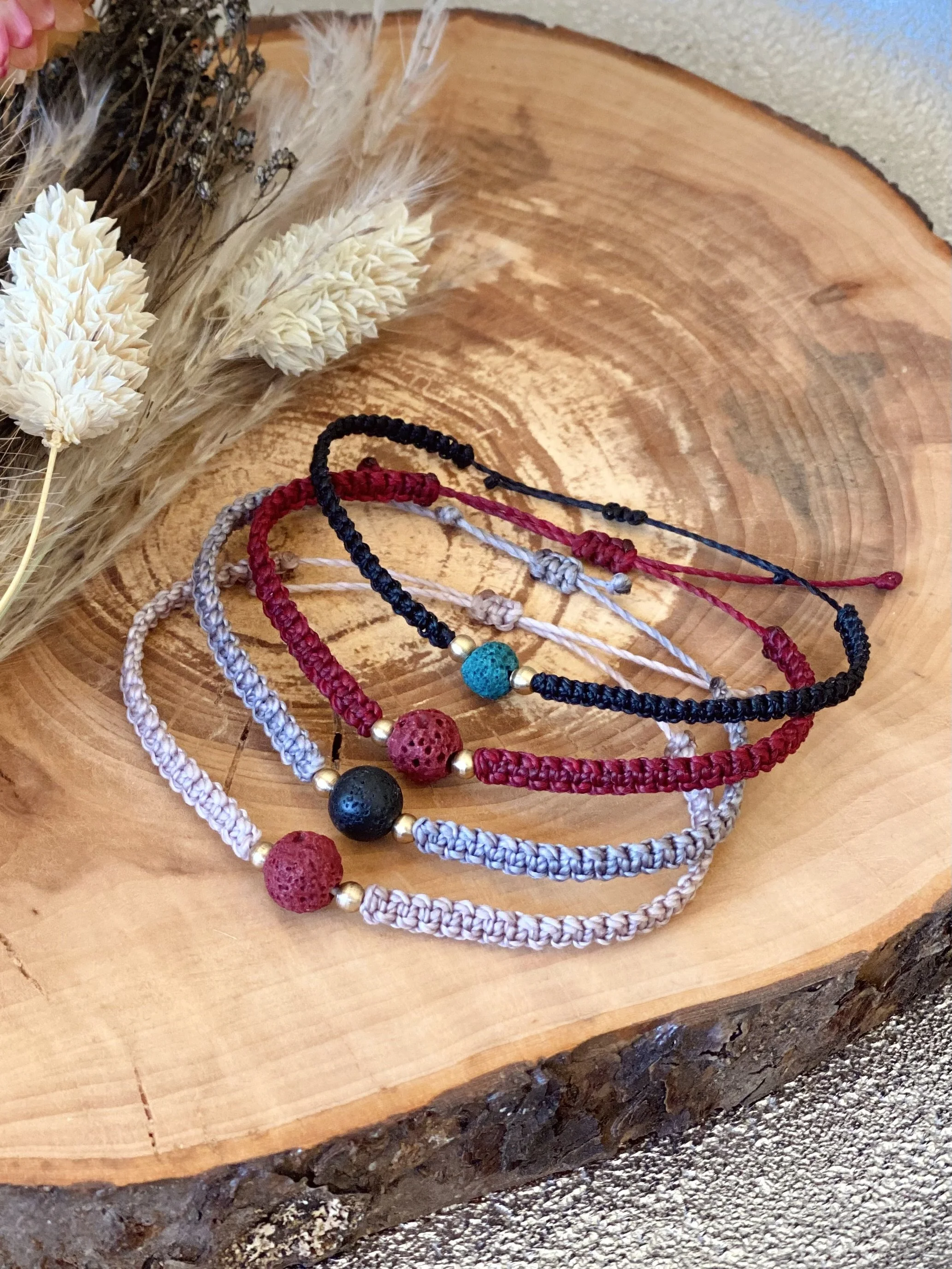 Die Diffuser-/Duftarmbänder bestehen aus einem flach oder als Helix geflochtenen Makrameeband und einer Lavaperle für das ätherische Öl. Gib einen Tropfen naturreines ätherisches Öl auf die Perle und genieße den herrlichen Duft.