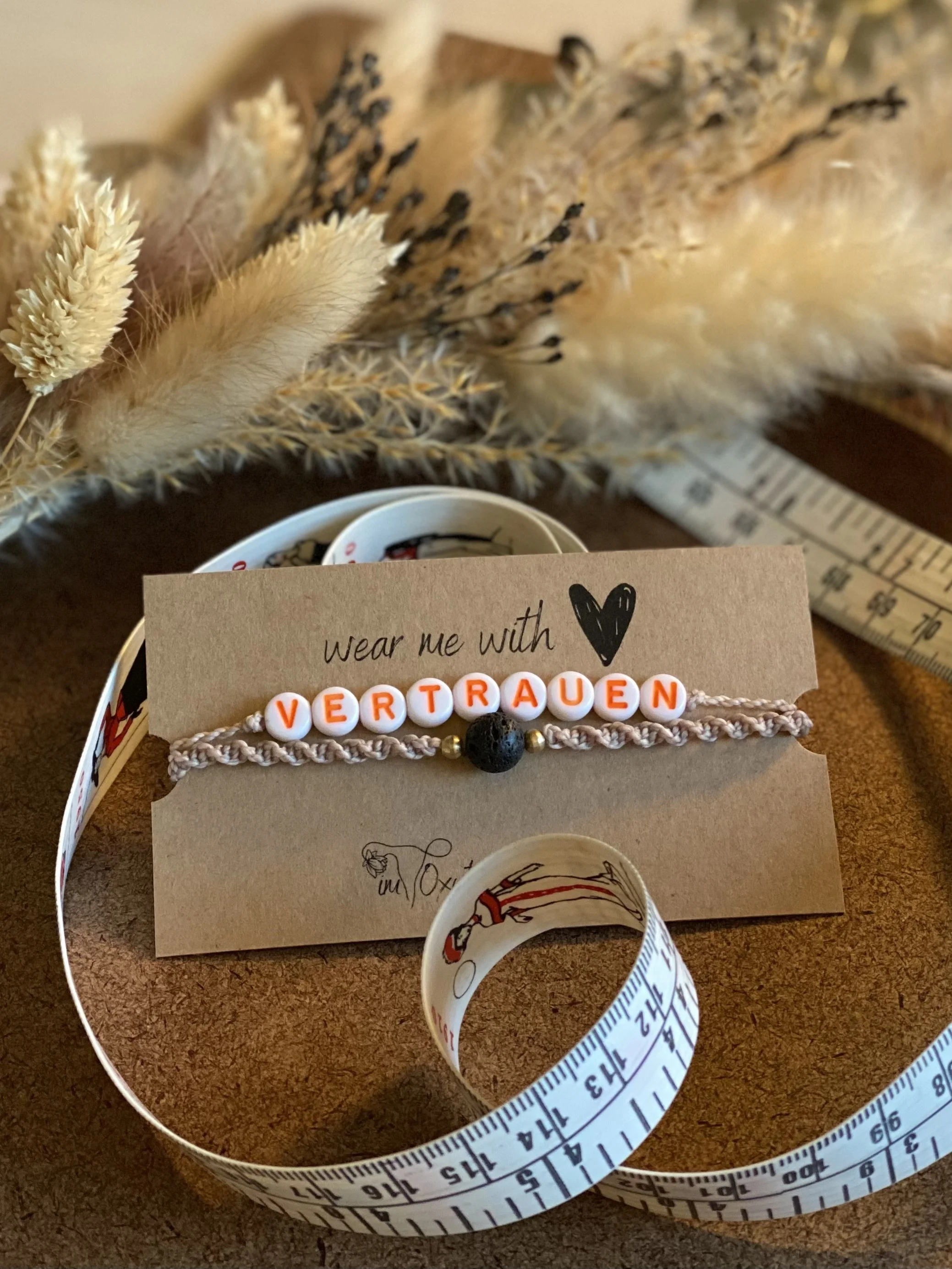 Das Armband besteht aus einem hochwertigen Makrameegarn (0,5-1,0mm), und Buchstabenperlen in 2 Varianten. Der Verschluss ist ein praktischer Schiebeverschluss. Das Armband hat (wenn nichts anderes besprochen wurde) einen maximalen Durchmesser von ca. 24cm
